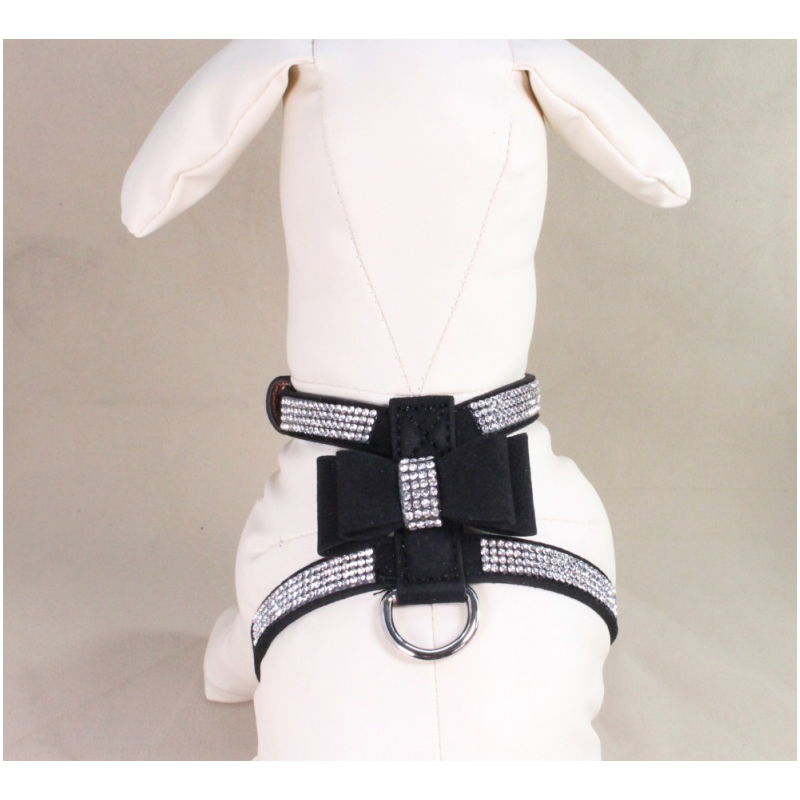 Luxusní postroj pro psa z broušené kůže. Lehce nastavitelný na obvod krku i hrudi. Postroj zdobí mašle a třpytivé kamínky vysokého lesku. Opravdu nádherné zpracování. Stříbrné doplňky (spony, očko)
