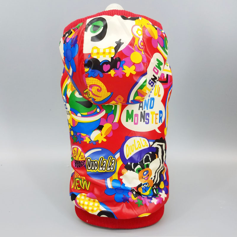 Krásná zateplená zimní bunda pro psa s potiskem. Kapuce krásně drží u zad, takže pejskům nevadí. Bunda je podšita kožíškem, nemá rukávy, skvěle sedí u zadečku a neodstává. Zapínání je na patentky.