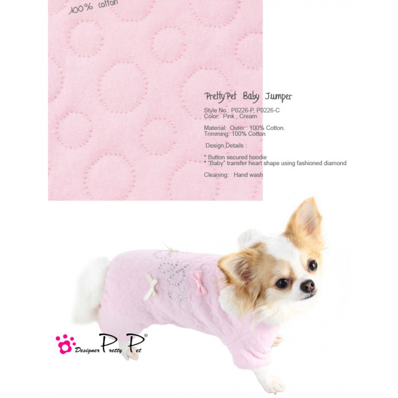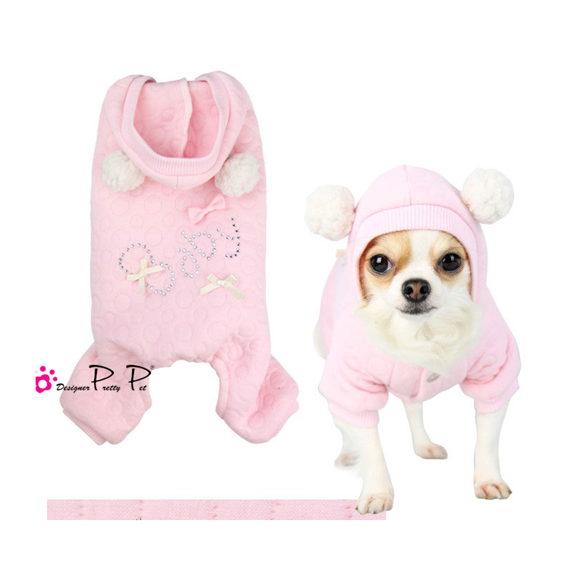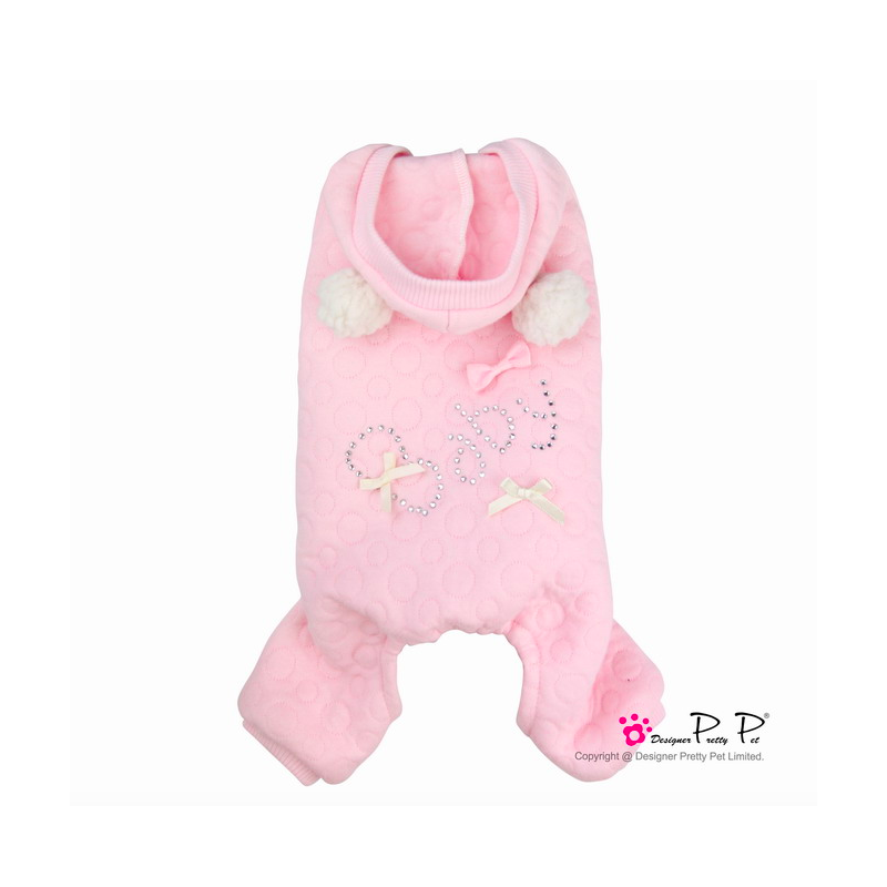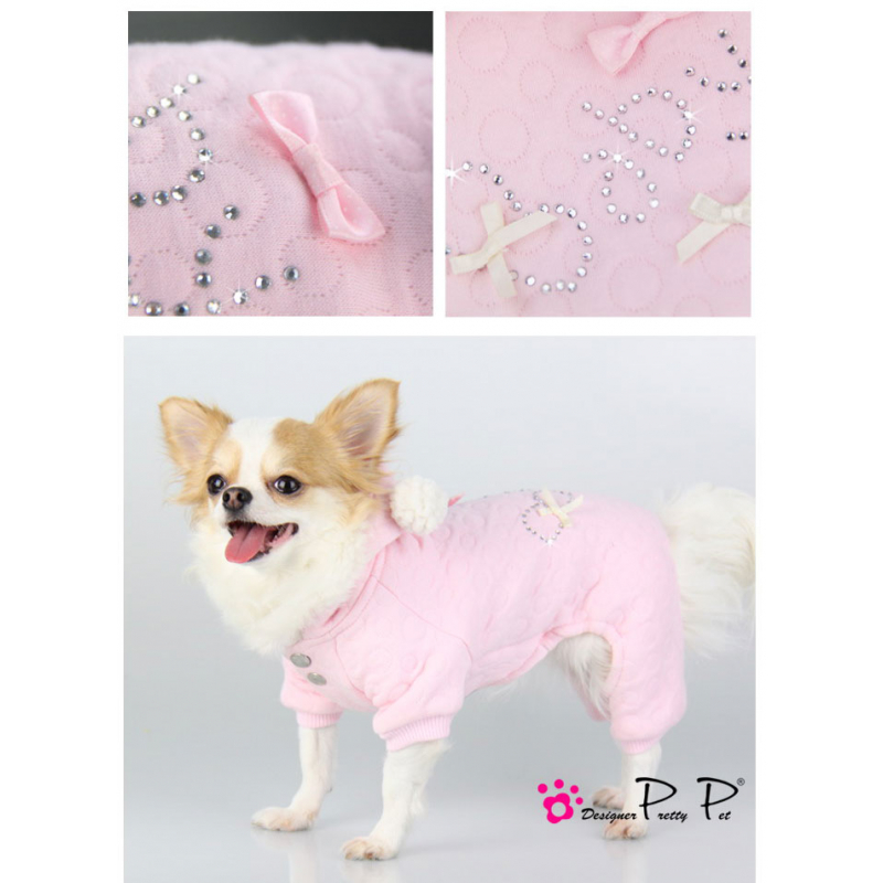 Nádherný overal pro pejska známé značky Pretty Pet. Zapíná se na dručky, kapuci zdobí bambulky. Velmi hebký a příjemný materiál. Na zádech je nápis z kamínků a maliné mašličky, které dodávají overalu ten správný šmrnc.