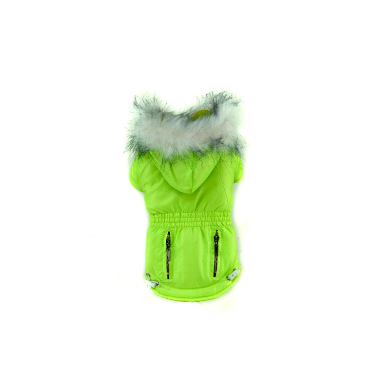 Zimní bunda pro psa s kapucí. Bunda má zapínání na patentky a je podšita fleesem. Bunda pro psa má očko na provlečení obojku a jeho snadné uchycení. Tento střih je velmi oblíbený mezi pejskaři a díky všité gumičce na hrudníku a stahování u zadečku bunda skvěle sedí.