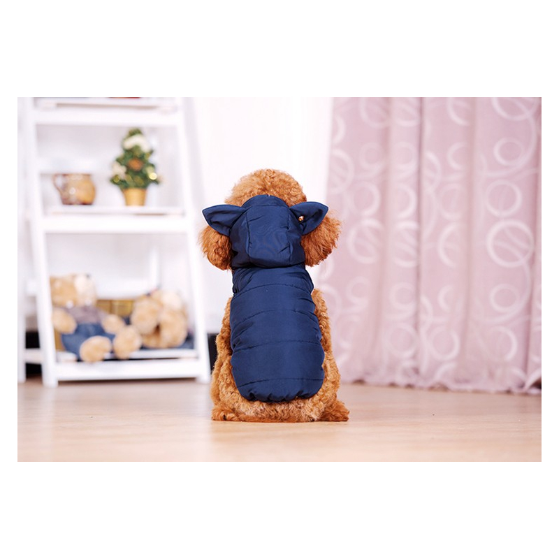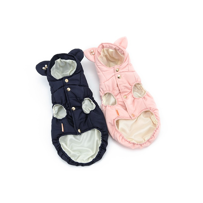 Krásná zimní bunda pro malého psa má super střih. Bunda má kapuci, kterou zdobí ouška a lze ji připnout k zádům, takže pejskům nevadí. Zapínání bundy je vyřešeno na patentky.