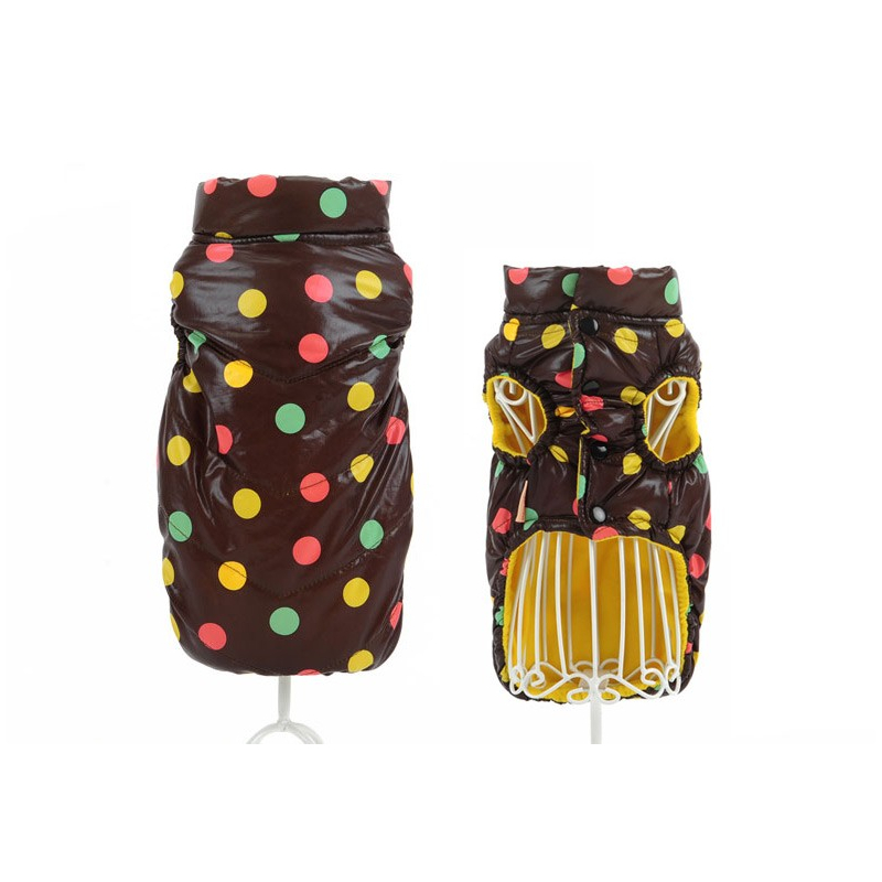 Krásná zimní bunda pro psa s puntíky. Skvělý střih, který nevadí pejskům a neomezuje je nijak v pohybu. Zapínání bundy je na patentky.