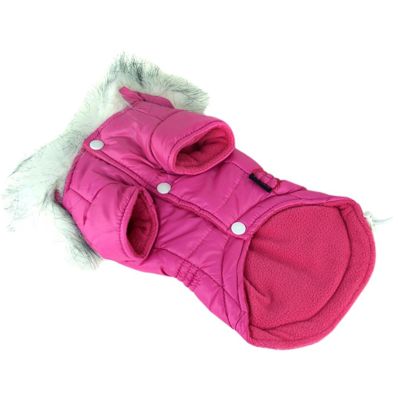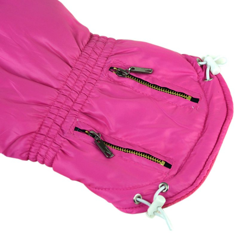 Růžová zimní bunda pro psa s kapucí. Bunda má zapínání na patentky a je podšita fleesem. Bunda pro psa má očko na provlečení obojku a jeho snadné uchycení. Tento střih je velmi oblíbený mezi pejskaři a díky všité gumičce na hrudníku a stahování u zadečku bunda skvěle sedí.