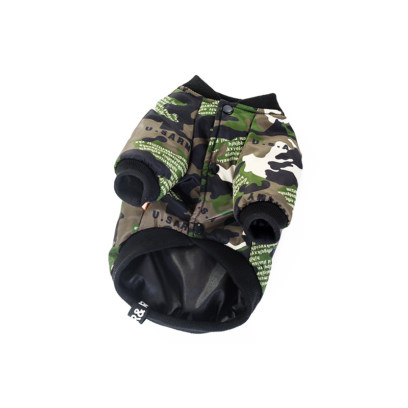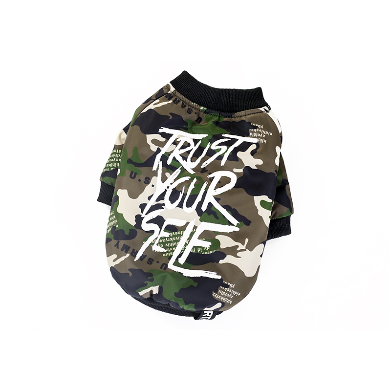 Stylová maskáčová bunda pro psa s nápisy na zádech. Bunda je vyteplená, takže vhodná na podzim, či zimu. Zapíná se na patentky. Rukávy bundy lze ohrnout.