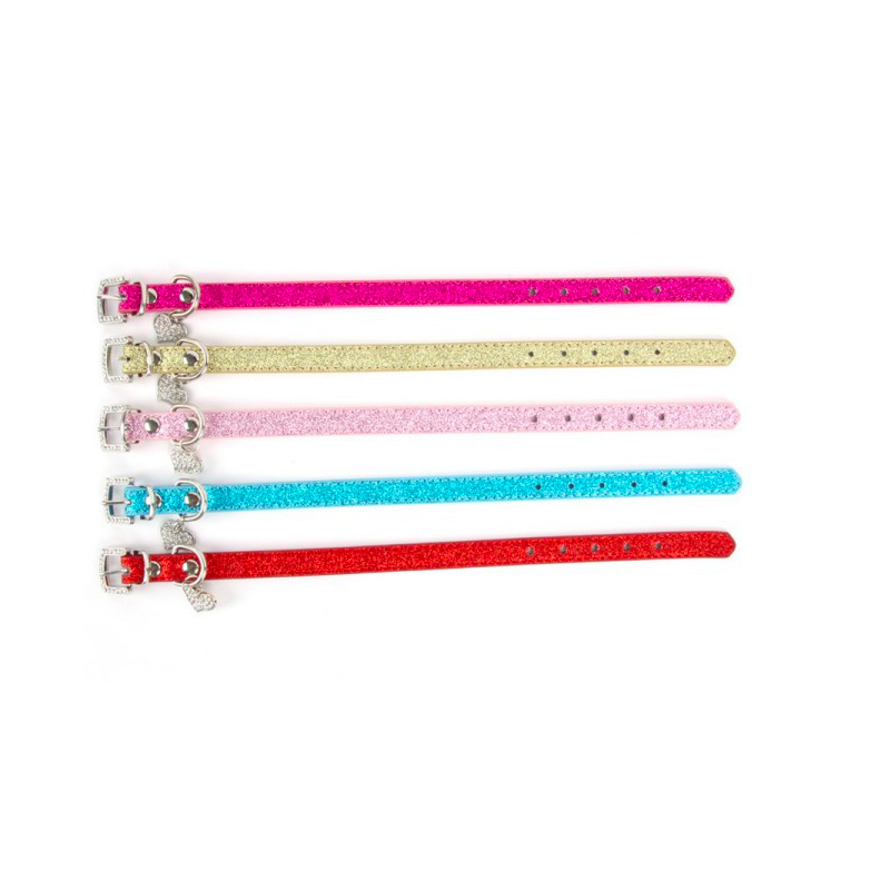 Krásný třpytivý obojek pro psa je hezká a vkusná ozdoba každého psího krčku. Obojek má ozdobu v podobě přívesku ve tvaru srdíčka, které je zdobeno kamínky. Spona je také zdobena kamínky. Nechybí ani očko pro připnutí vodítka,či psí známky.