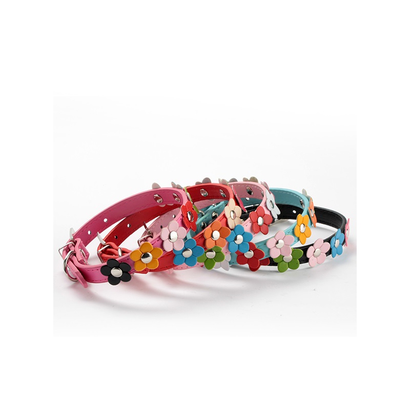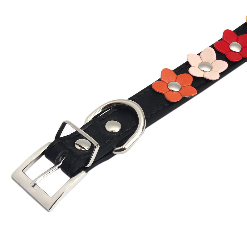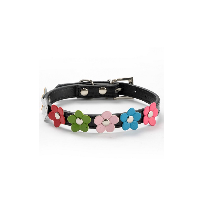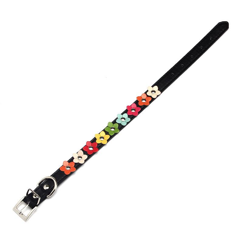 Krásný květovaný obojek pro psa rozveselí každý psí outfit. Obojek zdobí řada různobarevných květů z kůže. Spona je stříbrné barvy, nechybí očko pro připnutí psí známky, či vodítka.